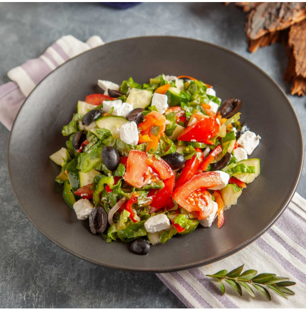 tomatoes, cucumbers, olives, feta cheese, onion, pepper, lemon, oil
