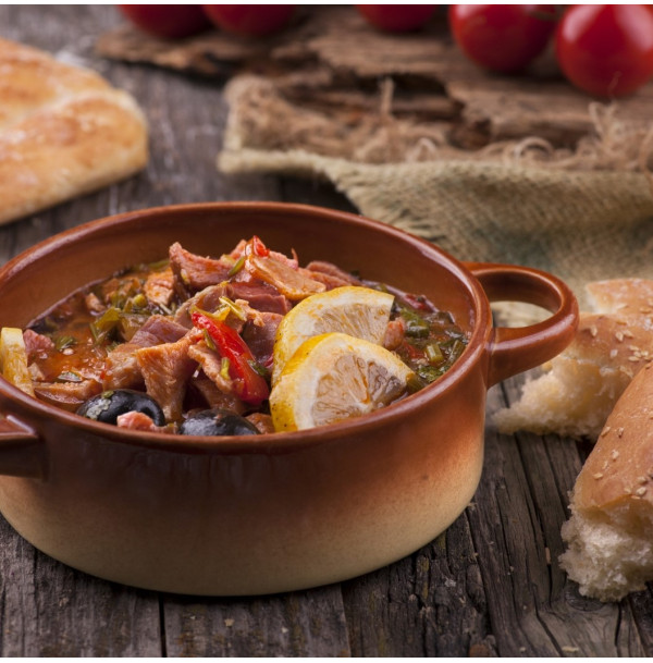 veal, sausage, ham, pickled cucumber, olives, lemon